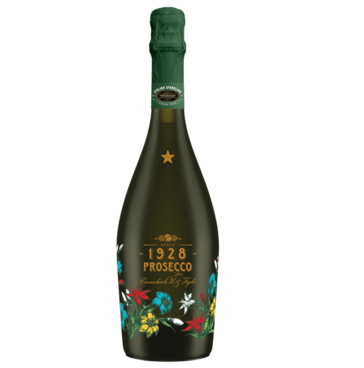 Cavicchioli 1928 Prosecco DOC Spumante Extra Dry should be drunk young and is excellent as an aperitif or as an accompaniment to whole meal; particularly suitable for appetizers, delicate first courses and fish-based dishes. Serving temperature: chilled to 40°F. Cavicchioli 1928 Prosecco DOC Spumante Extra Dry is made from 100% Glera grapes. In the province of Treviso, the vines are grown mostly on a flat fertile terrain of medium texture. In the winery, under-ripe” grapes (in order to preserve well the acidity), hand picked, are vinified in white with the skins at a temperature of 8-10°C (cryomaceration) for about 12 hours; the alcoholic fermentation at controlled temperature of 16-18°C is followed by the second fermentation using the Charmat method at a temperature of 12-14 °C for about 15-24 days. Cavicchioli 1928 Prosecco DOC Spumante Extra Dry features, when poured and tasted, white foam; lively, fine and persistent perlage; pale straw yellow color; an intense aroma of candied fruits and sweet flowers; and a fresh and delicate taste with an aromatic finish; its alcohol is 11%.