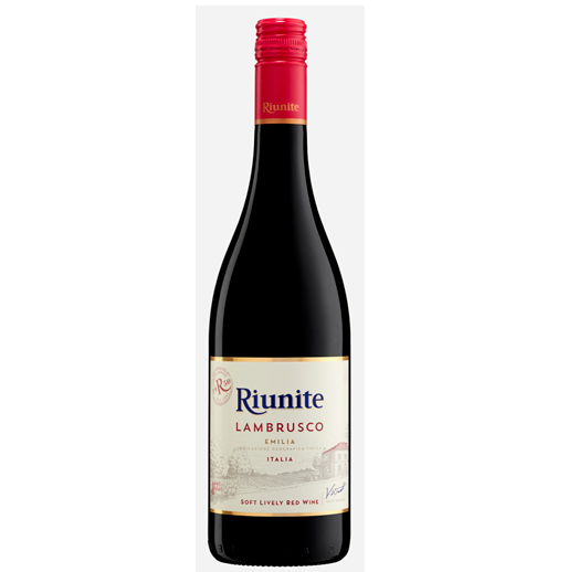 Riunite Lambrusco is a semi-sparkling wine with a lively and bright ruby-red color. It has a soft and harmonious taste. The perfume is fresh and fruity. Ideal with simple and light dishes, it is excellent to pair with traditional Italian cuisine as well as spicy dishes, grilled meats, and pizza. From the foothills and plains of the Reggio Emilia and Modena zones. Fertile, deep and medium-mixture grounds, 800 feet above sea level. The pressing and brief maceration of select grapes is followed by the fermentation of the must at controlled temperature. A second fermentation, using the Charmat method, imparts the characteristic sparkling note.
