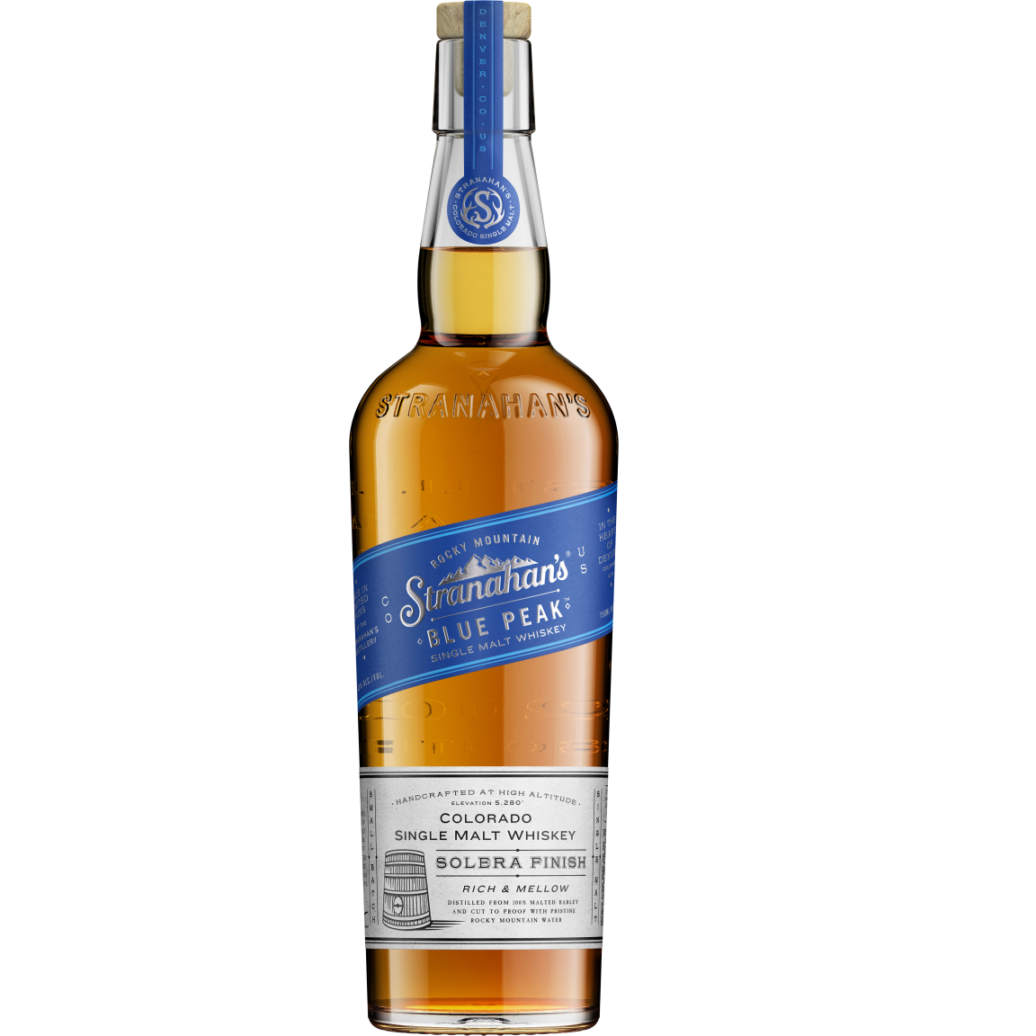 Named for a 13-thousand-foot peak in Aspen, Stranahans Blue Peak Single Malt is double-distilled at high altitude and aged for 4 years in new American oak barrels with a #3 char, imbuing a warm, toasted flavor. The Solera finished spirit boasts flavors of creamy butterscotch, brown sugar plus baked apples with notes of cayenne and toasted oak. (43% ABV-86 proof)